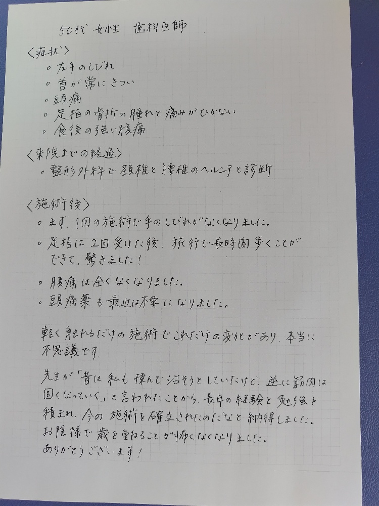 あらゆるところで 治療を受けたが 全く効果がなく 宗教にもすがったが全く効果がなかった 患者さん 診察券52枚も 持っておられました この方の場合 1回の治療後 ほとんど症状がなくなり 劇的に回復しました 全症状が消失し 元気を取り戻されました。こちら側の言うことを素直に受け入れる方は劇的な改善が見られるようです
